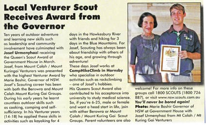 Josef Urmenyhazi, 18, from Mt Colah/Mt Ku-ring-ai Venturers, was presented with the highest Venturer award by NSW Governor Professor Marie Bashir last month.